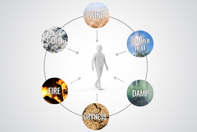 In condizioni ordinarie la maggior parte di questi fattori climatici compare con l’andamento alternante al variare delle stagioni, essi promuovono la crescita e i cambiamenti normali in tutti gli esseri viventi. Se le modificazioni sono però anormali (eccessivo caldo o freddo) o si verificano nel periodo sbagliato (caldo in inverno, fresco in estate) possono diventare fattori patogeni perchè il corpo umano può non essere in grado di adattarvisi autonomamente.