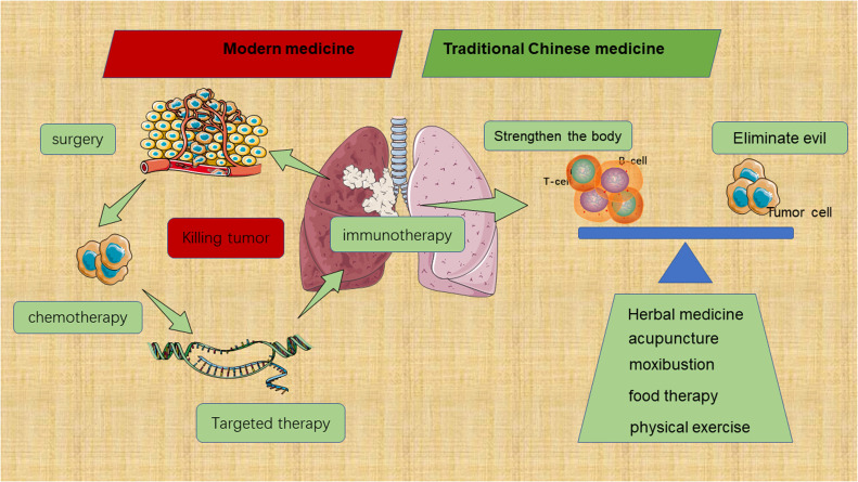 E’ utile ricordare che , la teoria più basilare della MTC nel trattamento del tumore ai polmoni, è la regolazione dello squilibrio “rafforzando il corpo” ed “eliminando il male” quando l’immunità del corpo è troppo debole e la capacità di crescita del tumore è troppo forte. “Rafforzare il corpo” significa potenziare l’immunità antitumorale del corpo, mentre “eliminare il male” inibisce direttamente la crescita, la proliferazione, l’invasione e la migrazione delle cellule tumorali. Questo accento sulla necessità di rafforzamento del corpo per combattere le cellule tumorali, coincide in parte con la teoria dell’immunoterapia.