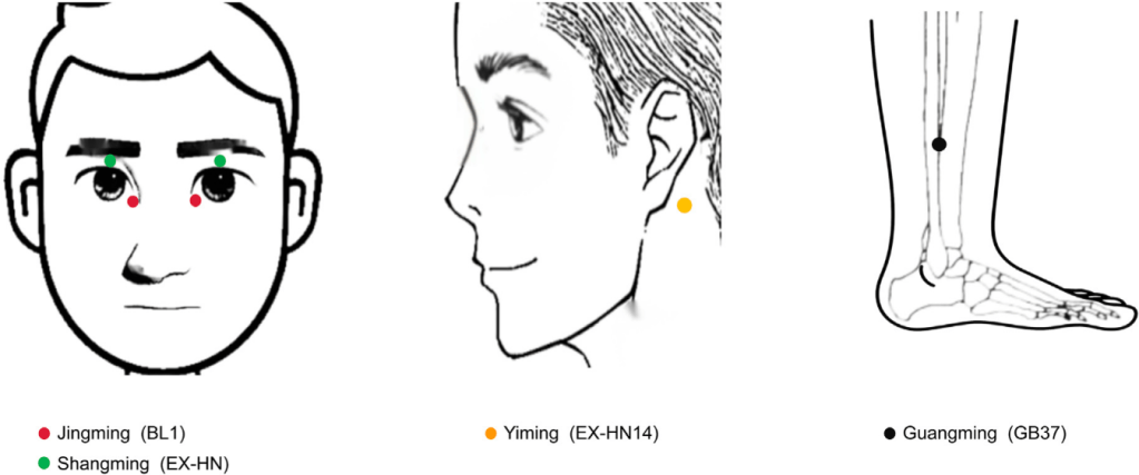 I “Quattro punti di digitopressione Ming” si riferiscono ai punti di agopuntura Shangming, Jingming, Yiming e Guangming. Il punto Shangming è situato nella parte frontale dell’arcata sopracciliare, sotto il margine orbitale superiore, e si ritiene che migliori la vista. Il punto Jingming è considerato il punto di intersezione di cinque meridiani, incluso il meridiano Yangming (Stomaco e Intestino crasso), i meridiani YinQiao e YangQiao, e si ritiene che elimini il calore e migliori la vista. Il punto Yiming, che è un punto straordinario al di fuori del meridiano, si trova 1 pollice dietro il punto terapeutico Yifeng e si ritiene che migliori la vista e promuova la calma. Il punto Guangming è situato lungo il meridiano Piede-Shaoyang della Cistifellea e può trattare efficacemente le malattie oculari refrattarie (vedere Fig. 1).